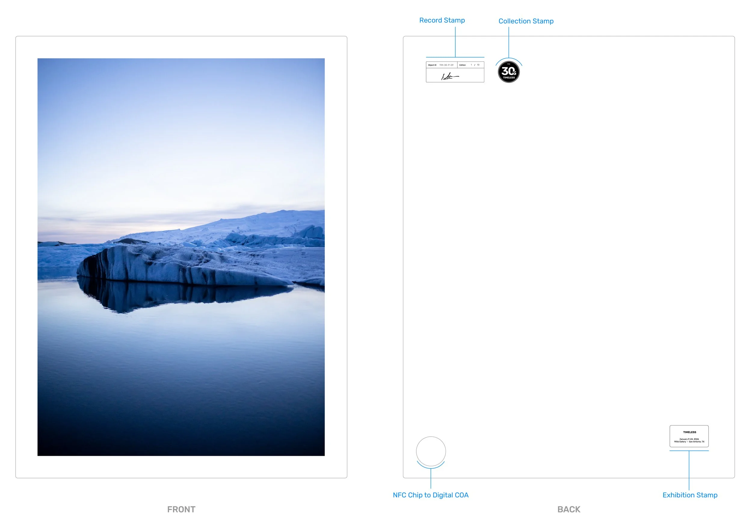 Each image had a secure NFC/QR tag affixed to the back, linking directly to the permanent, blockchain-verified Certificate of Authenticity (COA), ensuring the artwork’s provenance remains with the piece over time and can be verified instantly with an NFC-enabled device. This was part of linking physical objects to digital content.