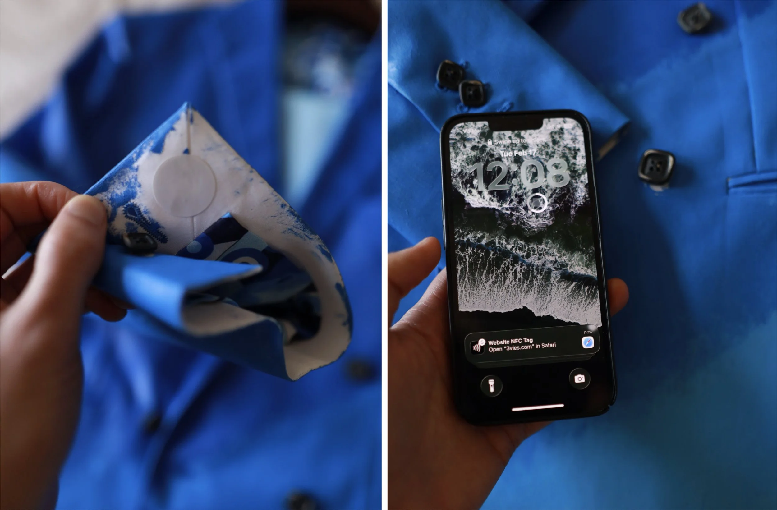 I had wanted to add an embedded NFC tag into the clothes so that during the night, as we walked about and interacted with friends, we could talk about the NFC tags, and it would show them how it worked, which would then spur them to go discover more by scanning the photos and wall labels. We achieved this with a simple NFC chip that adhered to the right cuff. This provided another layer of embedded technology that was invisible until you interacted with it.